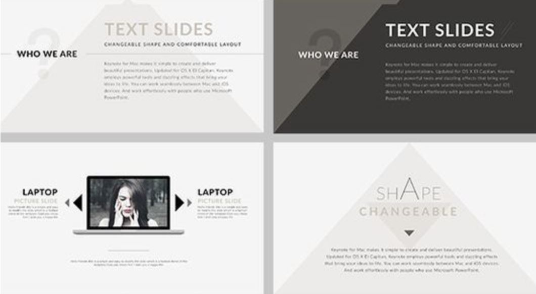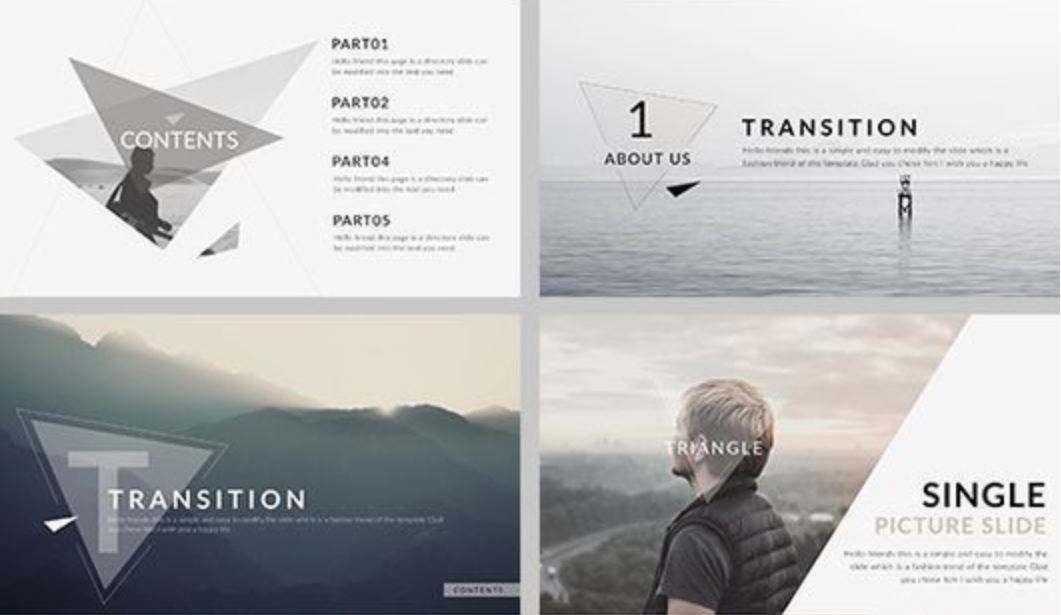 아래의 레퍼런스를 보면 삼각형을 포인트 디자인으로 잡고 목차의 배경화면, 이미지 데코, 슬라이드의 텍스트 박스, 포인트 디자인까지 다양하게 슬라이드 내에 활용한 것을 보실 수 있습니다.