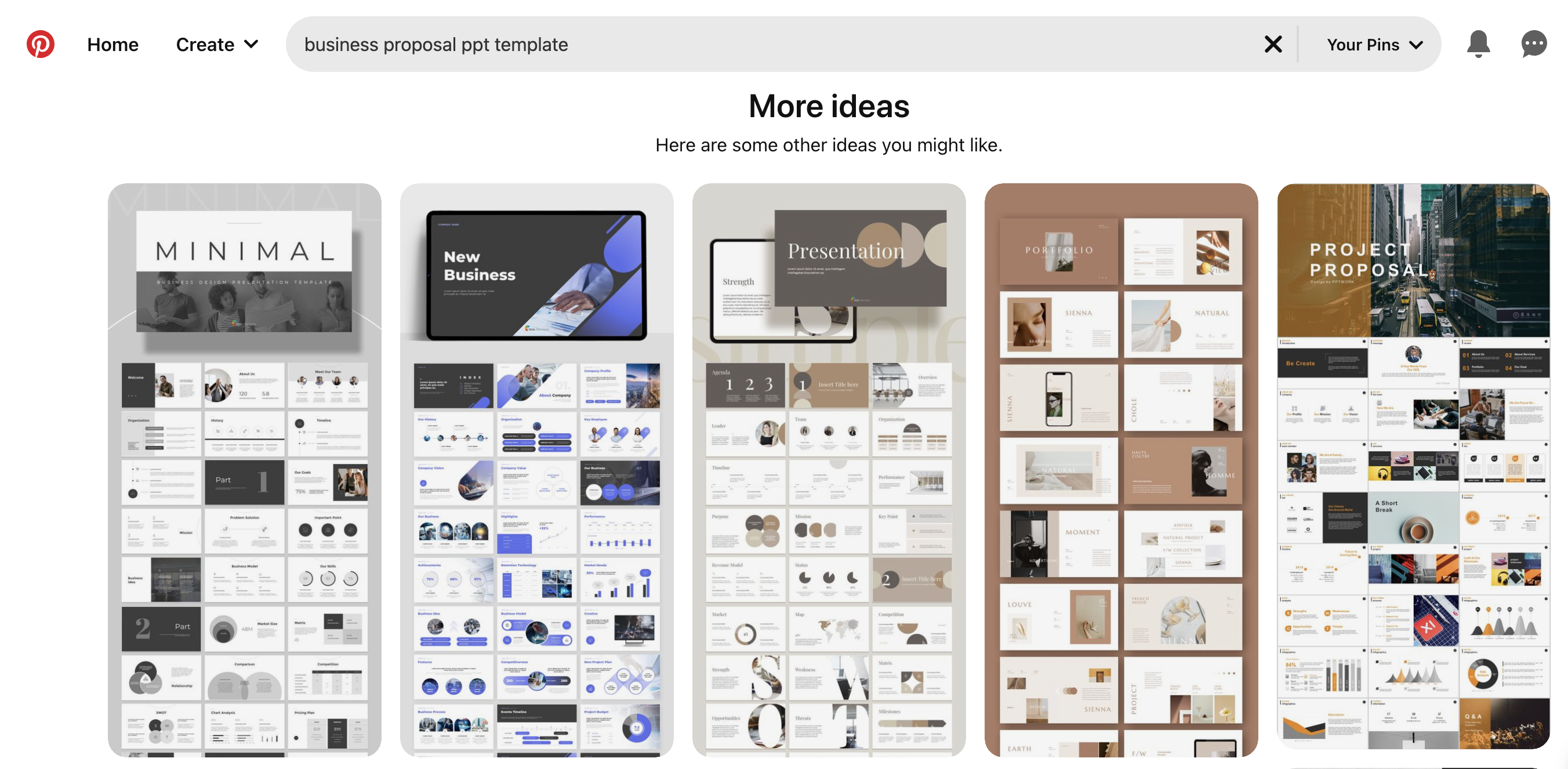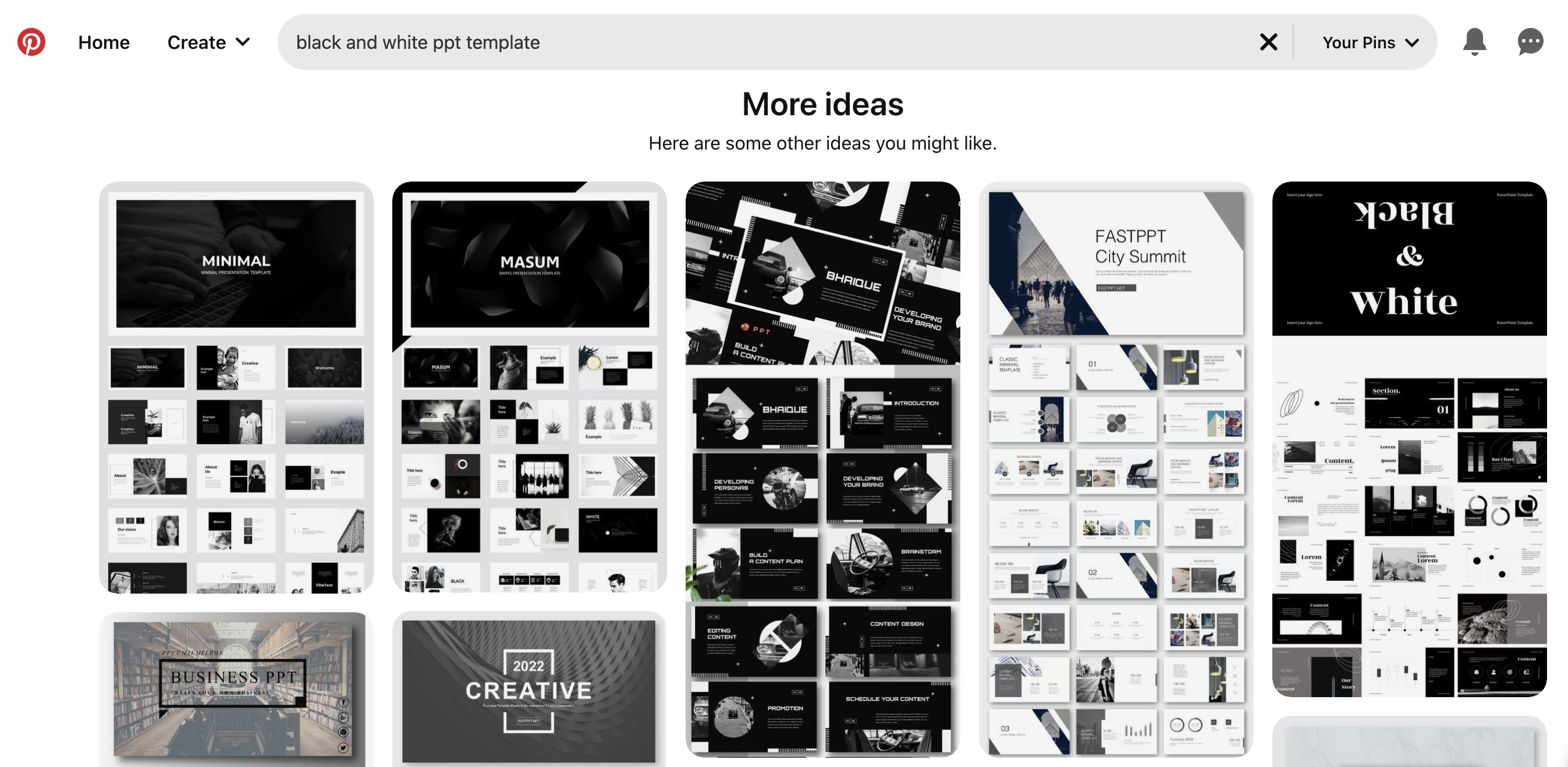 개인적으로 PPT를 많이 만들다 보니 매번 새로운 PPT의 콘셉트와 톤 앤 매너를 고민하게 되는데요. 이때 가장 많이 활용하는 사이트가 핀터레스트입니다. 이미지 자료를 찾아볼 수 있는 사이트인 핀터레스트에서 PPT 템플릿들을 검색해 보고 디자인과 콘셉트를 잡는데 활용합니다. 아래 캡처 이미지처럼 'black and white ppt template', 'red ppt template'와 같이 원하는 색깔의 PPT 템플릿을 모아서 보거나 'business proposal ppt template' 과같이 목적에 따라 템플릿을 검색해 보는 것도 좋은 방법입니다.