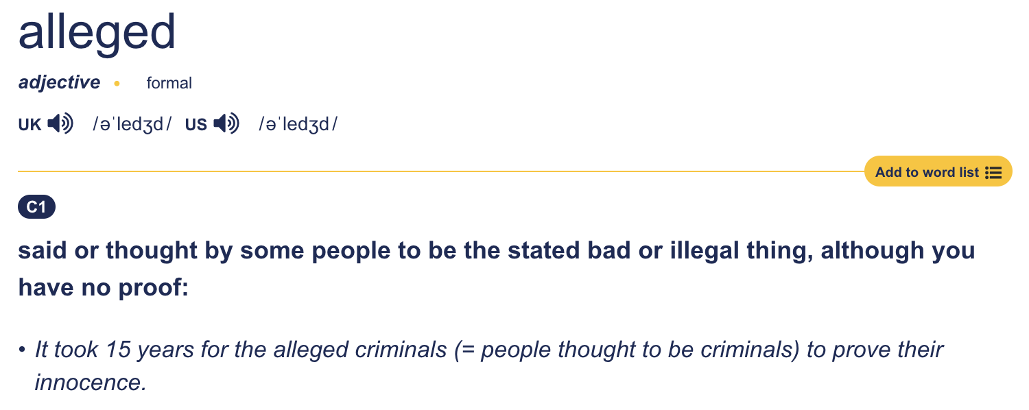 먼저 'alleged'라는 단어를 캠브리지 영어 사전에 검색해보면, 형용사(adjective)로 "증거는 없지만 일부 사람들이 나쁘거나 불법적인 것으로 말하거나 생각한 경우"라는 의미를 가진다고 나오는데요.