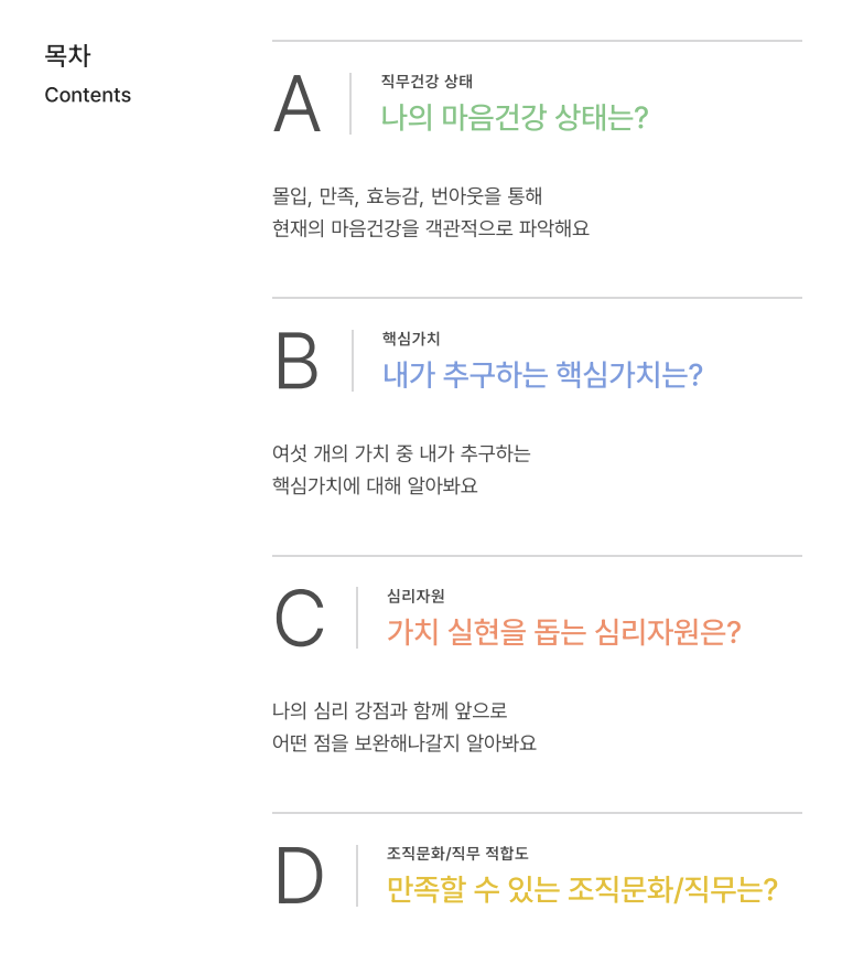 목차는 A 직무건강 상태 > B 핵심가치 > C 심리자원 > D 조직문화/직무적합도로 구성이 되어 있습니다.