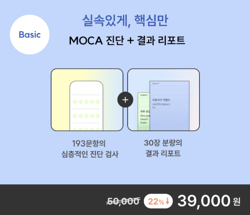 우선 가장 중요한 건 비용이겠죠. MOCA는 진단 테스트를 진행하고 30장 분량의 진단 리포트(MOCA 리포트)를 받아보는 Basic 유형과 진단 테스트 진행 후 30장 분량의 진단 리포트와 45분 동안 심리 전문가의 해석 세션까지 포함한 Premium 유형 두 가지가 있습니다.